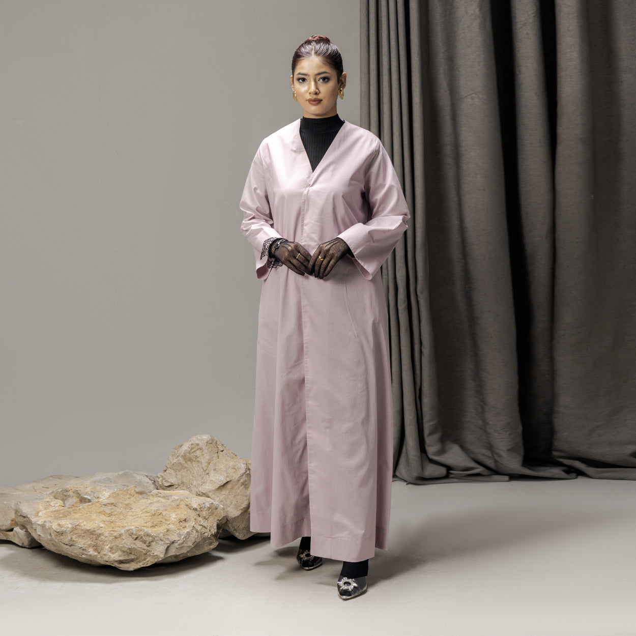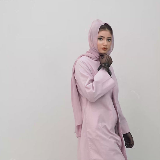 The ASHLAY PINK is crafted from premium korean imported soft cotton in a soft blush tone, designed with a clean V-neckline and a fluid, elongated silhouette. Gentle in movement yet polished in structure, it delivers a calm expression of modern modest luxury with everyday elegance.